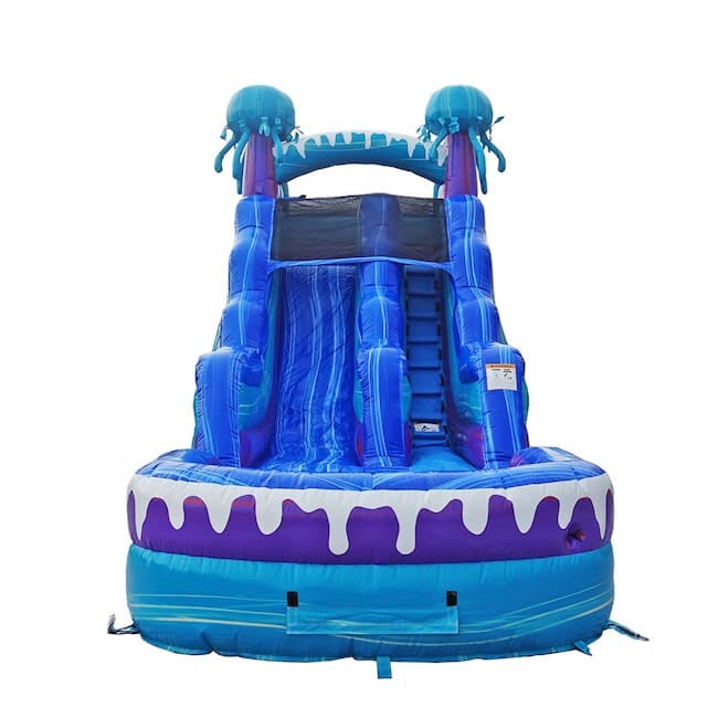 Our 15' Jellyfish themed water slide is great for all ages. This water slide is recommended for kids 5 years old and older to adults. Requires a water source nearby to fill up the pool. The pool is removable, so it can also be placed next to an inground pool. All rentals are 9 hours max per day.