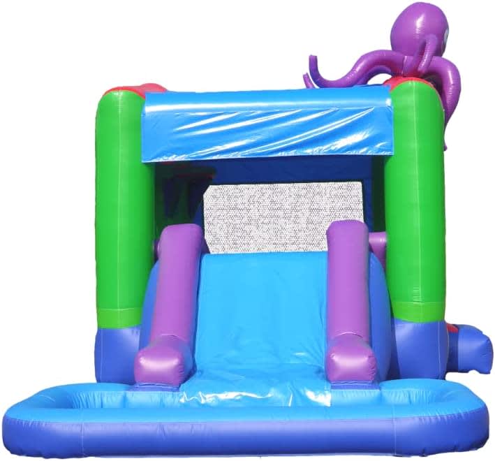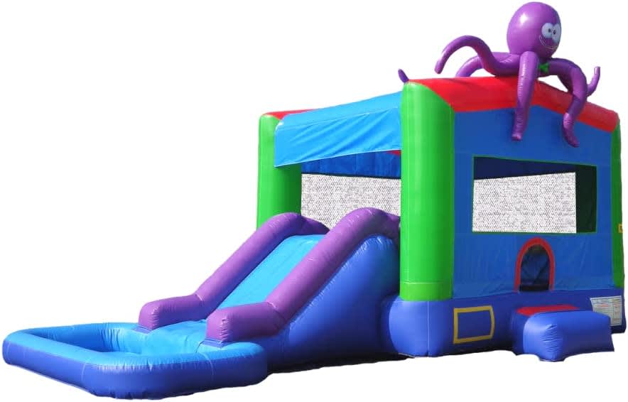 The 13' x 25' x 13' Octopus Bounce House Water Slide with Splash Pool is an exciting and versatile party rental option that guarantees hours of fun for both kids and adults. This inflatable water slide offers a combination of wet and dry activities, providing entertainment regardless of the weather.